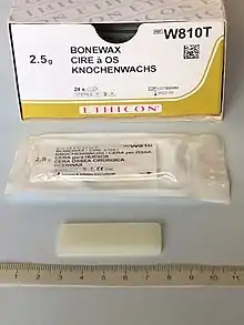 It is generally made of beeswax[1] with a softening agent such as paraffin or petroleum jelly and is smeared across the bleeding edge of the bone, blocking the holes and causing immediate bone hemostasis through a tamponade effect. Bone wax is most commonly supplied in sterile sticks, and usually requires softening before it can be applied.