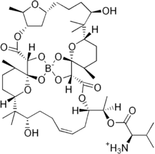Boromycin is a bacteriocidal polyether-macrolide antibiotic. It was initially isolated from the Streptomyces antibioticus, and is notable for being the first natural product found to contain the element boron. It is effective against most Gram-positive bacteria, but is ineffective against Gram-negative bacteria. Boromycin kills bacteria by negatively affecting the cytoplasmic membrane, resulting in the loss of potassium ions from the cell.