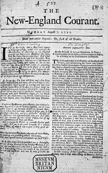 The outbreak was the first time in American medicine where the press was used to inform (or alarm) the general public about a health crisis.[1] The New England Courant, under the leadership of its new editor 16 year-old Benjamin Franklin, continued to publish satirical articles about the Mather and inoculation in the months following the epidemic.[7] Boylston wrote an account of his experiences with inoculation in An Historical Account of the Small Pox Inoculated in New England. Most of Boston's clergy seemed to have supported inoculation, and some wrote an op-ed opposing Williams and Douglass's criticism: "tho [Dr. Boylston] has not had... an Academic Education, and congruently not the Letters of some Physicians in town, yet he ought by no means be called Illiterate, Ignorant, etc. Would the town bear that Dr. Cutter or Dr. Davis be so treated?" Minister Benjamin Coleman, believing in inoculation, collected inoculation stories from slaves similar to Onesimus's account and published "Some observations on the new method of receiving the small pox by ingrafting or inoculation" in opposition to Douglass. [5]
