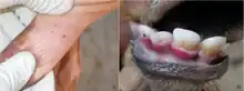 In other animals the lesions are reddish, raised, sometimes ulcerative lesions on the lips, muzzle, and in the mouth. It usually occurs before the age of two years.[4]
