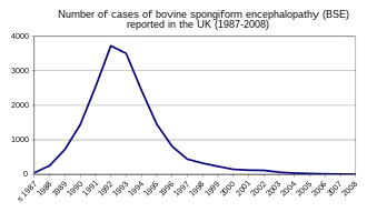 Four cases were reported globally in 2017, and the condition is considered to be nearly eradicated.[1] In the United Kingdom, from 1986 to 2015, more than 184,000 cattle were diagnosed with the peak of new cases occurring in 1993.[3] A few thousand additional cases have been reported in other regions of the world.[1] In addition, it is believed that several million cattle with the condition likely entered the food supply during the outbreak.[1]