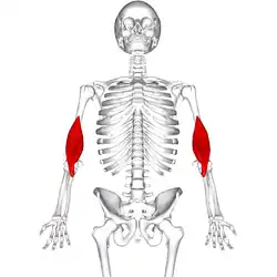 The brachialis (brachialis anticus), also known as the Teichmann muscle, is a muscle in the upper arm that flexes the elbow. It lies beneath the biceps brachii, and makes up part of the floor of the region known as the cubital fossa (elbow pit). It originates from the anterior aspect of the distal humerus;[1] it inserts onto the tuberosity of the ulna. It is innervated by the musculocutaneous nerve,[2] and commonly also receives additional innervation from the radial nerve.[3] The brachialis is the prime mover of elbow flexion generating about 50% more power than the biceps.[1]