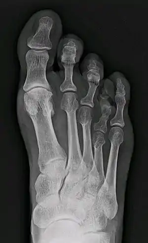 Brachymetatarsia is a condition in which there is one or more abnormally short or overlapping toe bones (metatarsals).[1] This condition may result due to a congenital defect or it may be an acquired condition.[1] It most frequently involves the fourth metatarsal. If it involves the first metatarsal, the condition is known as Morton's syndrome.[1] Treatment is via a number of differing surgical procedures.[1]