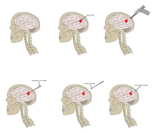 When an abnormality of the brain is suspected, stereotactic (probing in three dimensions) brain needle biopsy is performed and guided precisely by a computer system to avoid serious complications. A small hole is drilled into the skull, and a needle is inserted into the brain tissue guided by computer-assisted imaging techniques (CT or MRI scans). Historically, the patient's head was held in a rigid frame to direct the probe into the brain; however, since the early 1990s, it has been possible to perform these biopsies without the frame. Since the frame was attached to the skull with screws, this advancement is less invasive and better tolerated by the patient. The doctor (pathologist) prepares the sample for analysis and studies it further under a microscope.