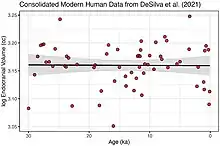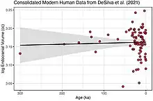 Modern human cranial size over the last 300 ka using data consolidated into 100-year means according to one 2022 study[4]
