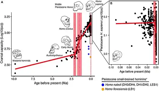 Trends in hominin brain size evolution[7]
