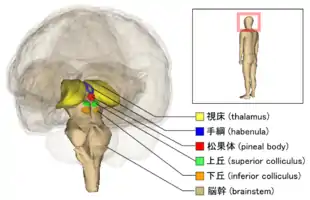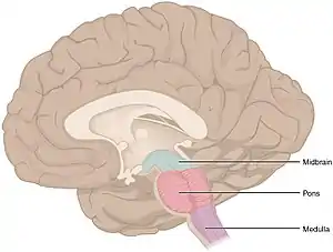 ![]() The three distinct parts of the brainstem are colored in this sagittal section of a human brain. | |
