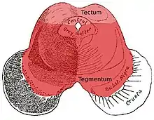 The midbrain is further subdivided into three parts: tectum, tegmentum, and the ventral tegmental area. The tectum forms the ceiling. The tectum comprises the paired structure of the superior and inferior colliculi and is the dorsal covering of the cerebral aqueduct. The inferior colliculus is the principal midbrain nucleus of the auditory pathway and receives input from several peripheral brainstem nuclei, as well as inputs from the auditory cortex. Its inferior brachium (arm-like process) reaches to the medial geniculate nucleus of the diencephalon. The superior colliculus is positioned above the inferior colliculus, and marks the rostral midbrain. It is involved in the special sense of vision and sends its superior brachium to the lateral geniculate body of the diencephalon.