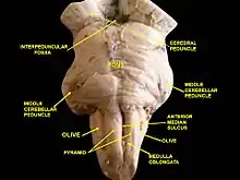 The pons lies between the midbrain and the medulla oblongata. It is separated from the midbrain by the superior pontine sulcus, and from the medulla by the inferior pontine sulcus.[9] It contains tracts that carry signals from the cerebrum to the medulla and to the cerebellum and also tracts that carry sensory signals to the thalamus. The pons is connected to the cerebellum by the cerebellar peduncles. The pons houses the respiratory pneumotaxic center and apneustic center that make up the pontine respiratory group in the respiratory center. The pons co-ordinates activities of the cerebellar hemispheres.[10] The pons and medulla oblongata are parts of the hindbrain that form much of the brainstem.