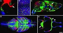 The complexity of the Drosophila brain, consisting of about 100,000 neurons, makes it an excellent candidate for implementing neurophysiology and neuroscience techniques like Brainbow. In fact, Stefanie Hampel et al. (2011) combined Brainbow in conjunction with genetic targeting tools to identify individual neurons within the Drosophila brain and various neuronal lineages.[6] One of the genetic targeting tools was a GAL4/UAS binary expression system that controls the expression of UAS-Brainbow and targets the expression to small groups of neurons. Utilizing ‘Flip Out’ methods increased the cellular resolution of the reporter construct. The expression of fluorescent proteins, as with the original Brainbow, depended on Cre recombination corresponding with matched lox sites. Hampel et al. (2011) also developed their own variation of Brainbow (dBrainbow), based on antibody labeling of epitopes rather than endogenous fluorescence.[6] Two copies of their construct yield six bright, separable colors. This, along with simplifications in color assignment, enabled them to observe the trajectories of each neuron over long distances. Specifically, they traced motor neurons from the antennal lobe to neuromuscular junctions, allowing them to identify the specific muscle targets of individual neurons.