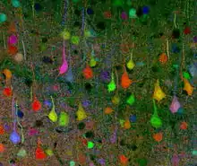 Brainbow was initially developed by Jeff W. Lichtman and Joshua R. Sanes at Washington University in St. Louis, though they have moved to Harvard University since then.[1] The team constructed Brainbow using a two-step process: first, a specific genetic construct was generated that could be recombined in multiple arrangements to produce one of either three or four colors based on the particular fluorescent proteins (XFPs) being implemented.[4] Next, multiple copies of the same transgenic construct were inserted into the genome of the target species, resulting in the random expression of different XFP ratios and subsequently causing different cells to exhibit a variety of colorful hues.[4]