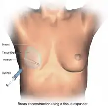 Implant-based reconstruction may be one- or two-staged.[5] In one-stage reconstruction, a permanent implant is inserted at the time of mastectomy. During two-stage reconstruction, the surgeon will insert a tissue expander underneath the pectoralis major muscle of the chest wall at the time of mastectomy.[6][7] This temporary silastic implant is used to hold tension on the mastectomy flaps. In doing so, the tissue expander prevents the breast tissue from contracting and allows for use of a larger implant later on compared to what would be safe at the time of the mastectomy.[3] Following this initial procedure, the patient must return to the clinic on multiple occasions for saline to be injected into a tube inside the tissue expander. By doing this slowly over the course of several weeks, the space beneath the pectoralis major muscle is safely expanded to an appropriate size without causing too much stress on the breast tissue. A second procedure is then necessary to remove the tissue expander and replace it with the final, permanent prosthetic implant.[8]