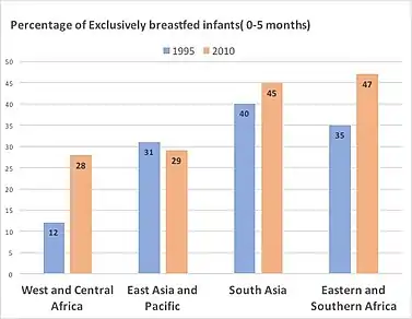 WHO infant feeding recommendation states infants should be breastfed exclusively for the first six months of life to achieve optimal growth, development and health.[62] Exclusive breastfeeding (EBF) refers to the practice of feeding an infant on breastmilk alone for the first six months of life without supplementing of other food or even water.[63][64] According to WHO and UNICEF, mothers should initiate the breastfeeding within the first hour after birth. Thereafter, exclusive breastfeeding should be continued for at least the first six months of life before addition of supplementary feeding.[65] Exclusively breastfed infants can only take oral rehydration solution, vitamins and minerals, and prescribed medications.[65] Scientific studies carried out by WHO and UNICEF have shown that both the mother and the child benefit from breastfeeding.[66] Breastfeeding is a cost-effective intervention that reduces the infant mortality and morbidity by lowering the risk of sickness from acute and chronic infections.[65] Prevalence of EBF increased in almost all regions in the developing world, from 1995 to 2010.[67] The biggest improvement can be seen in the West and Central Africa where the prevalence of EBF is more than doubled from 12% in 1995 to 28% in 2010. Southern and Eastern Africa also shows improvements with an increase from 35% in 1995 to 47% in 2010.[67] However, according to the UNICEF, there are no satisfactory changes in the EBF rates for the first six months since 1990. In order to provide breastfeeding support, WHO and UNICEF have developed two feeding programs, i.e.the 40-hour breastfeeding counseling, and the five-day infant and young child feeding counselling.[68][69] Furthermore, Yılmaz, Elif et al.,[70] in their clinical investigation report states, despite all the recommendations of the WHO, the rates of breastfeeding initiation and duration are still far from expectations worldwide.