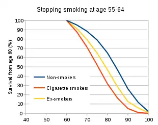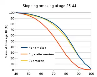 In the follow-up reports, published every ten years, more information became available. A major conclusion of the study is, for example, that smoking decreases life span up to 10 years, and that more than 50% of all smokers die of a disease known to be smoking-related, although the excess mortality depends on amount of smoking, specifically, on average, those who smoke until age 30 have no excess mortality, those who smoke until age 40 lose 1 year, those who smoke until 50 lose 4 years, and those who smoke until age 60 lose 7 years.[1]