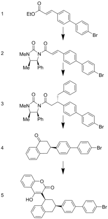 Brodifacoum is a derivative of the 4-hydroxy-coumarin group. Compounds numbers are found next to their respective compounds in the image below. Compound 1 is the starting ester needed to synthesize brodifacoum. To obtain this starting Compound 1, a simple Wittig condensation of ethyl chloroacetate with 4’-bromobiphenylcarboxaldehyde is accomplished. Compound 1 is transformed into Compound 2 by consecutive hydrolysis, halogenation to form an acid chloride, and then reacted with the required lithium anion. This is done using KOH and EtOH for hydrolysis, and then adding SOCl2 for chlorination to form the acid chloride which reacts with the addition of lithium anion. Compound 2 is then transformed using organocopper chemistry to yield Compound 3 with good stereoselectivity of about 98%. Typically, a Friedel-Crafts type cyclization would then be used to obtain the two-ring system portion of Compound 4, but this results in low yield. Instead, trifluoromethanesulfonic acid in dry benzene catalyzes the cyclization with good yield. The ketone is then reduced with sodium borohydride yielding a benzyl alcohol. Condensation with 4-hydroxycoumarin under HCl yields Compound 5, brodifacoum.[4]