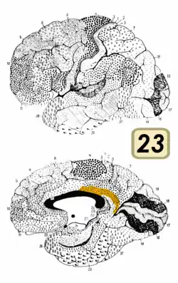 Brodmann area 23 (BA23) is a region in the brain that lies inside the posterior cingulate cortex. It lies between Brodmann area 30 and Brodmann area 31 and is located on the medial wall of the cingulate gyrus between the callosal sulcus and the cingulate sulcus.
