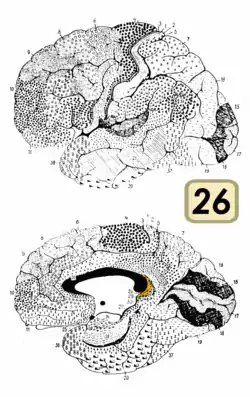 ![]() Medial surface of the brain with Brodmann's areas numbered. | |