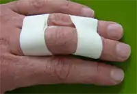 A broken finger may or may not require surgery. In simple cases, the bone may be put back in place and the finger may then be put in a splint, or strapped to another finger ("buddy taping").[3]