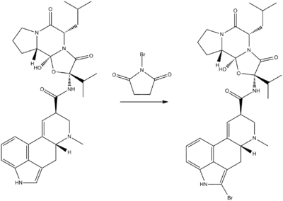 Bromocriptine is a semisynthetic derivative of a natural ergot alkaloid, ergocryptine (a derivative of lysergic acid), which is synthesized by bromination of ergocryptine using N-bromosuccinimide.[27][28]