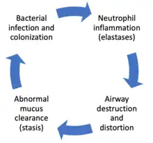 Disordered neutrophil function is believed to play a role in the pathogenesis of bronchiectasis. Neutrophil extracellular traps (NETs), which are extracellular fibers secreted by neutrophils that are used to trap and destroy pathogens, are hyperactive in bronchiectasis. Increased NET activity is associated with more severe bronchiectasis.[21] Neutrophil elastase, which is an extracellular protein secreted by neutrophils to destroy pathogens as well as host tissue, is also hyperactive in many cases of bronchiectasis.[21] An increased neutrophil elastase activity is also associated with worse outcomes and more severe disease in bronchiectasis.[21] The initial lung injury in bronchiectasis leads to an impaired mucociliary clearance of the lung airways, which leads to mucous stasis.[21] This mucous stasis leads to bacterial colonization in bronchiectasis which leads to neutrophil activation.[21] This neutrophil activation leads to further tissue destruction and airway distortion by neutrophils in addition to direct tissue destruction by the pathogenic bacteria.[21] The distorted, damaged lung airways thus have impaired mucociliary clearance; leading to mucous stasis and bacterial colonization leading to further neutrophil activation and thus fueling a self-perpetuating "vicious cycle" of inflammation in bronchiectasis.[21] This "vicious cycle" theory is the generally accepted explanation for the pathogenesis of bronchiectasis.[40]