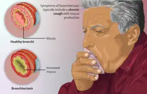 Bronchiectasis is a disease in which there is permanent enlargement of parts of the airways of the lung.[5] Symptoms typically include a chronic cough with mucus production.[3] Other symptoms include shortness of breath, coughing up blood, and chest pain.[2] Wheezing and nail clubbing may also occur.[2] Those with the disease often get lung infections.[8]