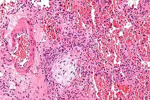 Micrograph showing a Masson body (off center left/bottom of the image – pale circular and paucicellular), as may be seen in cryptogenic organizing pneumonia. The Masson body plugs the airway. The artery associated with the obliterated airway is also seen (far left of the image). H&E stain.