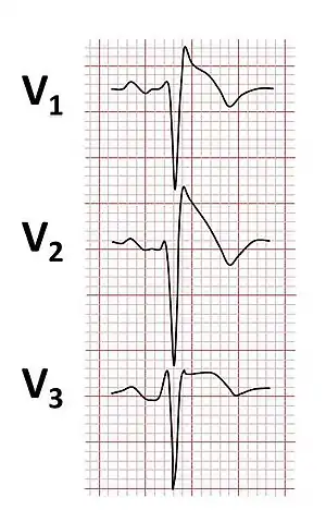 Brugada syndrome is diagnosed by identifying characteristic patterns on an electrocardiogram.[11] The pattern seen on the ECG includes ST elevation in leads V1-V3 with a right bundle branch block (RBBB) appearance. There may be evidence of a slowing of electrical conduction within the heart, as shown by a prolonged PR interval. These patterns may be present all the time, but may appear only in response to particular drugs (see below), when the person has a fever, during exercise, or as a result of other triggers. The ECG pattern may become more obvious by performing an ECG in which some of the electrodes are placed in different positions from usual, specifically by placing leads V1 and V2 higher up the chest wall in the 1st or 2nd intercostal spaces.[30]