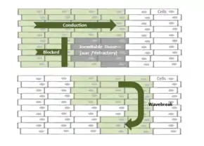 Some argue that the main reason these arrhythmias arise is due to abnormally slow electrical conduction in areas of the heart, specifically the right ventricle. The genetic variants associated with BrS support the concept as SCN5A, the gene most commonly associated with the condition, along with SCN10A, SCN1B, SCN2B and SCN3B, all directly affect the sodium current INa. The sodium current is a major contributor to the characteristic flow of electrical charge across the membrane of heart muscle cells that occurs with each heartbeat known as the action potential. INa causes the initial rapid upstroke of the action potential (phase 0), and decreasing the early peak current, as occurs in BrS-associated genetic variants, leads to slowing of the electrical conduction through the heart muscle.[7] This slow conduction allows 'short circuits' to form, blocking the waves of electrical activity in some areas while allowing the waves to pass in others in a phenomenon known as wavebreak. Given the right circumstances, this wavebreak can allow the waves of electricity to perform a U-turn within the muscle, travelling in the reverse direction before beginning to rapidly circle around a point, referred to as re-entry, and causing an abnormal heart rhythm.[7] Those who support this view (known as the depolarisation hypothesis) argue that conduction slowing may explain why arrhythmias in those with Brugada syndrome tend to occur in middle age, when other factors such as scarring or fibrosis that accompany old age have exacerbated the tendency to conduction slowing caused by the genetic mutation.[29]