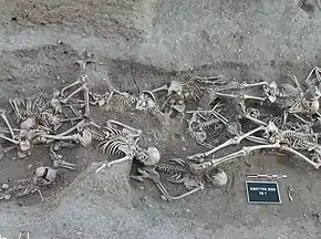 Yersinia pestis has been discovered in archaeological finds from the Late Bronze Age (~3800 BP).[39] The bacteria is identified by ancient DNA in human teeth from Asia and Europe dating from 2,800 to 5,000 years ago.[40] Some authors have suggested that the plague was responsible for the Neolithic decline.[41]