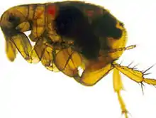 The flea is parasitic on house and field rats and seeks out other prey when its rodent host dies. Rats were an amplifying factor to bubonic plague due to their common association with humans as well as the nature of their blood.[15] The rat's blood allows the rat to withstand a major concentration of the plague.[15] The bacteria form aggregates in the gut of infected fleas, and this results in the flea regurgitating ingested blood, which is now infected, into the bite site of a rodent or human host. Once established, the bacteria rapidly spread to the lymph nodes of the host and multiply. The fleas that transmit the disease only directly infect humans when the rat population in the area is wiped out from a mass infection.[16] Furthermore, in areas with a large population of rats, the animals can harbor low levels of the plague infection without causing human outbreaks.[15] With no new rat inputs being added to the population from other areas, the infection only spread to humans in very rare cases of overcrowding.[15]
