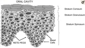 The buccal mucosa, along with the gingival and sublingual mucosa, is part of the oral mucosa.[15] It is composed of non-keratinised tissue. Unlike intestinal and nasal mucosae, it lacks tight junctions and is instead equipped with loose intercellular links of desmosomes, gap junctions and hemidesmosomes.[7] While it has a less permeable effect than sublingual administration, buccal administration is still capable of creating local or systemic effects following drug administration.[7] In the oral cavity, buccal tablets potentiate their effect by entering the bloodstream direction through the internal jugular vein into the superior vena cava,[8] avoiding acidic hydrolysis to take place in the gastrointestinal tract.[16]