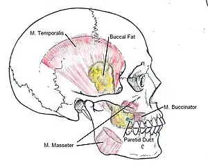 The buccal fat pad (also called Bichat’s fat pad, after Xavier Bichat, and the buccal pad of fat) is one of several encapsulated fat masses in the cheek. It is a deep fat pad located on either side of the face between the buccinator muscle and several more superficial muscles (including the masseter, the zygomaticus major, and the zygomaticus minor).[1] The inferior portion of the buccal fat pad is contained within the buccal space. It should not be confused with the malar fat pad, which is directly below the skin of the cheek.[2] It should also not be confused with jowl fat pads. It is implicated in the formation of hollow cheeks and the nasolabial fold, but not in the formation of jowls.[3]