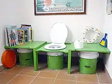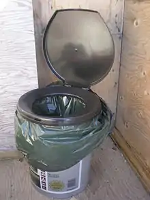 In natural disasters and other emergencies, the portability of bucket latrines can make them a useful part of an appropriate emergency response, especially where pit latrines cannot be isolated from floodwater or groundwater (potentially leading to groundwater pollution) and where the contents can be safely disposed into sanitary systems,[6] taking measures to avoid contact with the contents.[7] Different organizations give advice on how to build bucket toilets in case of emergency. The Twin Bucket Emergency Toilet system (a two bucket system), for example, has been developed in Christchurch, New Zealand following their infrastructure destroying earthquake in 2011. The system has been endorsed by the Portland Bureau of Emergency Management.[8] It is promoted by the volunteer advocacy group PHLUSH (Public Hygiene Lets Us Stay Human) for reasons of safety, affordability, and matching ecological sanitation principles.[9]