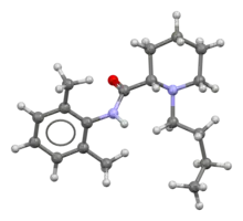 Like lidocaine, bupivacaine is an amino-amide anesthetic; the aromatic head and the hydrocarbon chain are linked by an amide bond rather than an ester as in earlier local anesthetics. As a result, the amino-amide anesthetics are more stable and less likely to cause allergic reactions. Unlike lidocaine, the terminal amino portion of bupivacaine (as well as mepivacaine, ropivacaine, and levobupivacaine) is contained within a piperidine ring; these agents are known as pipecholyl xylidines.[13]