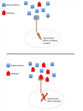 At lower doses, buprenorphine results in the usual opioid effects; high doses beyond a certain level do not result in greater effects.[7] This is believed to result in a lower risk of overdose than some other opioids.[7] Naloxone is an opioid antagonist that competes with and blocks the effect of other opioids (including buprenorphine) if given by injection.[2] Naloxone is poorly absorbed when taken by mouth and is added to decrease the risk that people will misuse the medication by injection.[1] Misuse by injection or use in the nose still occurs, and more recently the efficacy of naloxone in preventing misuse by injection has been brought into question and preparations including naloxone could even be less safe than preparations containing solely buprenorphine.[2][8] Rates of misuse in the U.S. appear to be lower than with other opioids.[9]