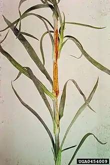 B. caryophylli infects many different species of the Dianthus plant. The species Dianthus barbatus (Sweet William) and Dianthus alwoodii (Allwoodii Hybrids) can be infected through induced artificial inoculation in a lab setting,[5] however, the pathogen only naturally infects the species D. caryophyllus (carnation). If infected, the pathogen induces symptoms on the host such as the discoloration of leaves and stems; they become grayish-green with subsequent yellowing. This initial leaf and stem discoloration is usually followed by plant wilting and death. Stem bases may also show internodal stem cracking, developing into small areas of dead tissue, which grow slowly over years (cankers). Cutting diseased stems often reveals brownish-yellow bacterial ooze.[3] The wilting of the plant signifies the presence of rotten roots. This causes a significant decrease in the plants ability to anchor itself into the soil. Symptoms can take up to 2–3 years to surface. Visual symptoms are most readily seen in mature plants by inspection of aerial parts.[3] Although there may be an extended period of latency, once plants begin showing symptoms, death typically occurs within 1–2 months. The contraction of Bacterial Wilt of Carnation is often followed by secondary fungal invasions and disease.