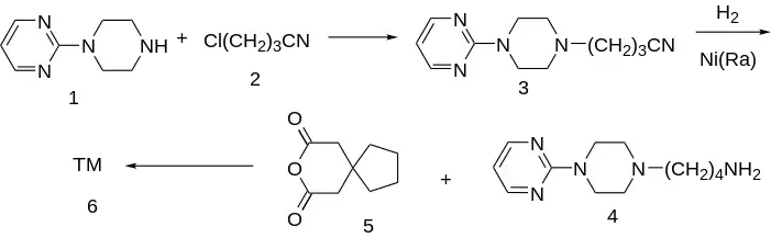 Alkylation of 1-(2-pyrimidyl)piperazine [20980-22-7] (1) with 3-chloro-1-cyanopropane (4-chlorobutyronitrile) [628-20-6] (2) gives [33386-14-0] (3). the reduction of the nitrile group is performed either by catalytic hydrogenation or with LAH giving [33386-20-8] (4). The primary amine is then reacted with 3,3-tetramethyleneglutaric anhydride [5662-95-3] (5) in order to yield Buspirone (6).