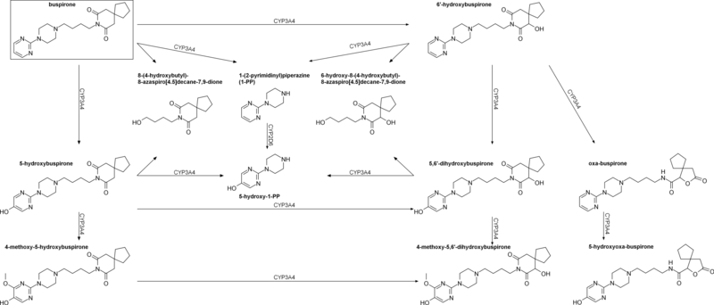 Buspirone has a low oral bioavailability of 3.9% relative to intravenous injection due to extensive first-pass metabolism.[2] The time to peak plasma levels following ingestion is 0.9 to 1.5 hours.[2] It is reported to have an elimination half-life of 2.8 hours,[2] although a review of 14 studies found that the mean terminal half-life ranged between 2 and 11 hours, and one study even reported a terminal half-life of 33 hours.[6] Buspirone is metabolized primarily by CYP3A4, and prominent drug interactions with inhibitors and inducers of this enzyme have been observed.[4][5] Major metabolites of buspirone include 5-hydroxybuspirone, 6-hydroxybuspirone, 8-hydroxybuspirone, and 1-PP.[55][6][7][8] 6-Hydroxybuspirone has been identified as the predominant hepatic metabolite of buspirone, with plasma levels that are 40-fold greater than those of buspirone after oral administration of buspirone to humans.[7] The metabolite is a high-affinity partial agonist of the 5-HT1A receptor (Ki = 25 nM) similarly to buspirone, and has demonstrated occupancy of the 5-HT1A receptor in vivo.[7] As such, it is likely to play an important role in the therapeutic effects of buspirone.[7] 1-PP has also been found to circulate at higher levels than those of buspirone itself and may similarly play a significant role in the clinical effects of buspirone.[50][52]