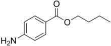 It is the ester of 4-aminobenzoic acid and butanol.[1] A white, odourless, crystalline powder. that is mildly soluble in water (1 part in 7000) and soluble in alcohol, ether, chloroform, fixed oils, and dilute acids. It slowly hydrolyses when boiled with water. Synonyms include Butamben, Butilaminobenzoato, and Butoforme.