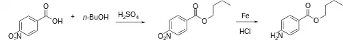 The esterification between 4-Nitrobenzoic acid [62-23-7] (1) and 1-Butanol [71-36-3] (2) gives Butyl 4-Nitrobenzoate [120-48-9] (3). Bechamp reduction then gives Butamben (4).