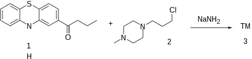 2-Butyrylphenothiazine [25244-91-1] (1) is the requisite starting material for carrying out the procedure. It is prepared in a manner that is synonymous with the method used in the propiomazine and propiopromazine already discussed. The 1-(γ-chloropropyl)-4-methylpiperazine [104-16-5] (2) is prepared in the conventional way from alkylating 1-methylpiperazine and 1-Bromo-3-chloropropane. Sodamide is used to extract the 10-H thereby facilitating the nucleophilic substitution reaction. And completing the instalment of the sidechain.