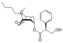It is a quaternary ammonium compound and a semisynthetic derivative of hyoscine hydrobromide (scopolamine). The attachment of the butyl-bromide moiety effectively prevents the movement of this drug across the blood–brain barrier, effectively minimising undesirable central nervous system side effects associated with scopolamine/hyoscine.[23]