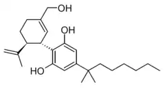 Cannabidiol-dimethylheptyl (CBD-DMH or DMH-CBD) is a synthetic homologue of cannabidiol where the pentyl chain has been replaced by a dimethylheptyl chain. Several isomers of this compound are known. The most commonly used isomer in research is (−)-CBD-DMH, which has the same stereochemistry as natural cannabidiol, and a 1,1-dimethylheptyl side chain. This compound is not psychoactive and acts primarily as an anandamide reuptake inhibitor, but is more potent than cannabidiol as an anticonvulsant and has around the same potency as an antiinflammatory.[1][2][3][4] Unexpectedly the “unnatural” enantiomer (+)-CBD-DMH, which has reversed stereochemistry from cannabidiol, was found to be a directly acting cannabinoid receptor agonist with a Ki of 17.4nM at CB1 and 211nM at CB2, and produces typical cannabinoid effects in animal studies,[5] as does its 7-OH derivative.[6]