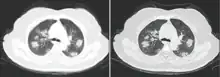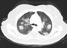 Chest CT scans may be helpful to diagnose COVID‑19 in individuals with a high clinical suspicion of infection but are not recommended for routine screening.[160][172] Bilateral multilobar ground-glass opacities with a peripheral, asymmetric, and posterior distribution are common in early infection.[160][173] Subpleural dominance, crazy paving (lobular septal thickening with variable alveolar filling), and consolidation may appear as the disease progresses.[160][174] Characteristic imaging features on chest radiographs and computed tomography (CT) of people who are symptomatic include asymmetric peripheral ground-glass opacities without pleural effusions.[175]