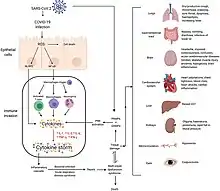 Although SARS-CoV-2 has a tropism for ACE2-expressing epithelial cells of the respiratory tract, people with severe COVID‑19 have symptoms of systemic hyperinflammation. Clinical laboratory findings of elevated IL‑2, IL‑7, IL‑6, granulocyte-macrophage colony-stimulating factor (GM‑CSF), interferon gamma-induced protein 10 (IP‑10), monocyte chemoattractant protein 1 (MCP1), macrophage inflammatory protein 1‑alpha (MIP‑1‑alpha), and tumour necrosis factor (TNF‑α) indicative of cytokine release syndrome (CRS) suggest an underlying immunopathology.[131]