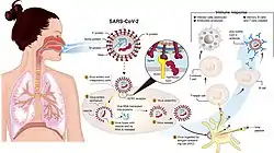 The SARS-CoV-2 virus can infect a wide range of cells and systems of the body. COVID‑19 is most known for affecting the upper respiratory tract (sinuses, nose, and throat) and the lower respiratory tract (windpipe and lungs).[114] The lungs are the organs most affected by COVID‑19 because the virus accesses host cells via the receptor for the enzyme angiotensin-converting enzyme 2 (ACE2), which is most abundant on the surface of type II alveolar cells of the lungs.[115] The virus uses a special surface glycoprotein called a "spike" to connect to the ACE2 receptor and enter the host cell.[116]