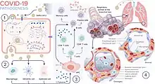 Systemic inflammation results in vasodilation, allowing inflammatory lymphocytic and monocytic infiltration of the lung and the heart. In particular, pathogenic GM-CSF-secreting T cells were shown to correlate with the recruitment of inflammatory IL-6-secreting monocytes and severe lung pathology in people with COVID‑19.[146] Lymphocytic infiltrates have also been reported at autopsy.[141]