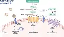 Human angiotensin converting enzyme 2 (hACE2) is the host factor that SARS-CoV-2 virus targets causing COVID‑19. Theoretically, the usage of angiotensin receptor blockers (ARB) and ACE inhibitors upregulating ACE2 expression might increase morbidity with COVID‑19, though animal data suggest some potential protective effect of ARB; however no clinical studies have proven susceptibility or outcomes. Until further data is available, guidelines and recommendations for hypertensive patients remain.[149]