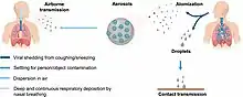 Infectious particles range in size from aerosols that remain suspended in the air for long periods of time to larger droplets that remain airborne briefly or fall to the ground.[86][87][88][89] Additionally, COVID-19 research has redefined the traditional understanding of how respiratory viruses are transmitted.[89][90] The largest droplets of respiratory fluid do not travel far, but can be inhaled or land on mucous membranes on the eyes, nose, or mouth to infect.[88] Aerosols are highest in concentration when people are in close proximity, which leads to easier viral transmission when people are physically close,[88][89][90] but airborne transmission can occur at longer distances, mainly in locations that are poorly ventilated;[88] in those conditions small particles can remain suspended in the air for minutes to hours.[88][91]Virology