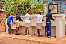 Several COVID-19 vaccines have been approved and distributed in various countries, which have initiated mass vaccination campaigns. Other preventive measures include physical or social distancing, quarantining, ventilation of indoor spaces, use of face masks or coverings in public, covering coughs and sneezes, hand washing, and keeping unwashed hands away from the face. While work is underway to develop drugs that inhibit the virus, the primary treatment is symptomatic. Management involves the treatment of symptoms through supportive care, isolation, and experimental measures.